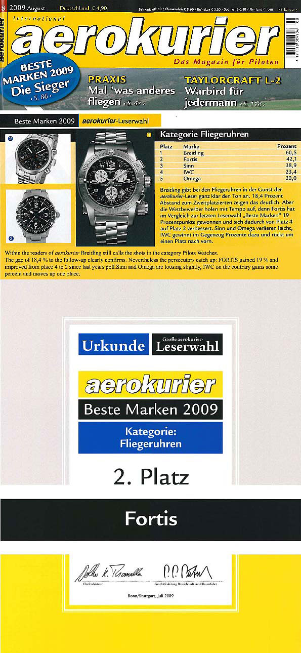 50年の歴史を持ち、読者の約8割がライセンス取得をしているパイロットというドイツの航空マガジン「aerokurier」において、読者による人気投票の結果、「パイロット・ウォッチ」のカテゴリーで42.1%の投票率でフォテルィスが第2位を獲得しました。前回の読者投票において23.1%の第4位から、今年は19%の支持率アップで順位も上がっています。