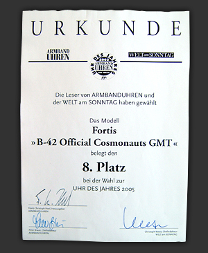 2005年3月31日に開催されたバーゼルワールドの初日の夜に、ドイツの雑誌「ARMBAND UHREN」とドイツの新聞「WELT am SONNTAG」の読者投票による"WATCH OF THE YEAR 2005"の結果が発表され、フォルティスの「B-42コスモノート GMT 3タイムゾーン(REF.649.10.11M)」が第8位を受賞しました。