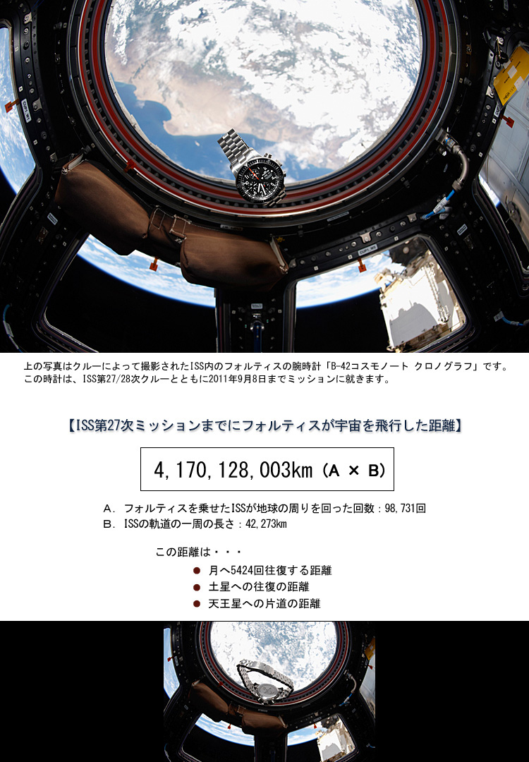 第27/28次クルーは「B-42コスモノート クロノグラフ」(Ref.638.10.11M)を、第28/29次クルーは「B-42コスモノート デイデイト」(Ref.647.10.11M)をそれぞれ公式装備品として装着し、2011年7月現在、合計6本のフォルティスの腕時計がクルーたちをサポートしています。6月のISS第28/29次ミッション以降、クルーたちは異なる化学実験を遂行し、ISSの維持と修復を行っています。