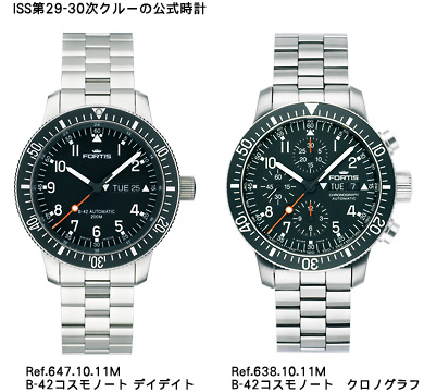 今回の第29次ミッションでは、フォルティスのB-42コスモノート クロノグラフとB-42コスモノート デイデイトの2種類の腕時計が公式装備品となり、ミッションをサポートしています。2012年3月までクルーとともにミッションに就く予定です。 |