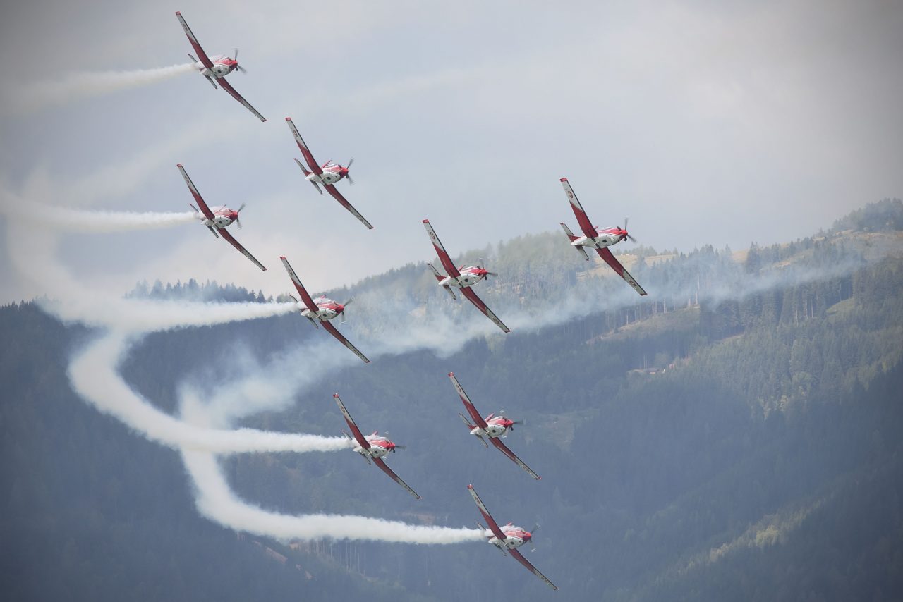 イタリア空軍の曲芸飛行部隊“フレッチェ・トリコローリ”、フランス空軍の“パトルイユ・ド・フランス”、スペイン空軍の“パトルーラ・アギラ”。チーム名はすでに航空ショーのファンの注目を集めています。シュタイアーマルク州の上空で、スピード感あふれる戦闘機に乗り、ヨーロッパで最も大胆不敵なパイロットたちが繰り出す演技は、このショーの観客やフォルティスチームを驚かせました。