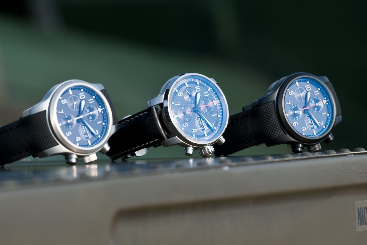 写真左から:エアロマスター スチール クロノグラフ、フリーガープロ クロノグラフ、エアロマスター ステルス クロノグラフ。