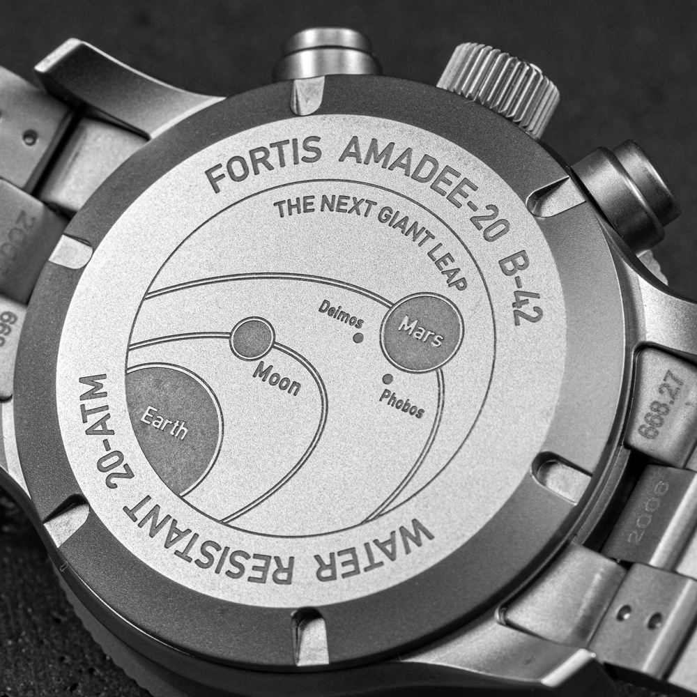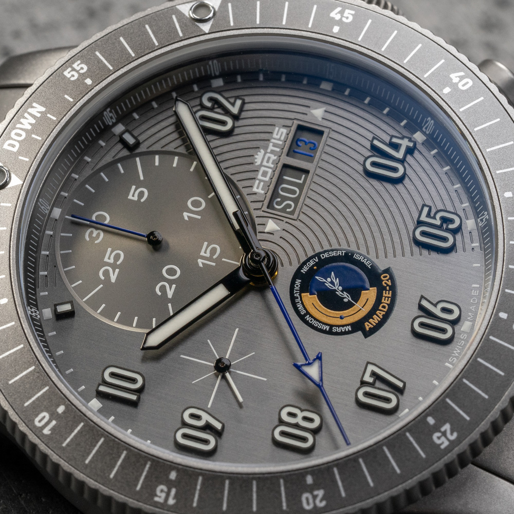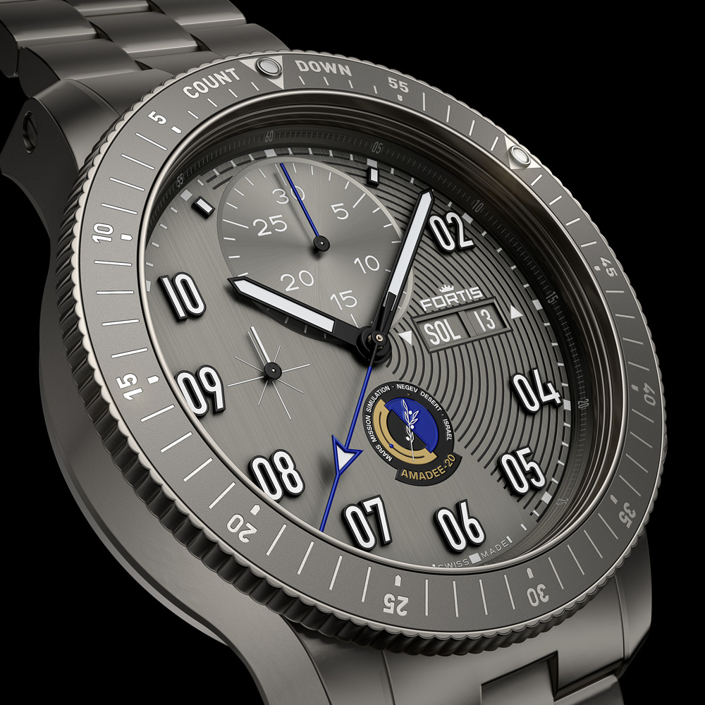 地球と火星の間の広大な距離(それぞれの軌道上の位置により5,460万kmから4,014万km)のため、ふたつの間には大幅な通信の遅れが生じます。そのタイムラグは3分から21分で、1つのメッセージのやりとりには最大で42分かかることになります。アマディ20のミッションでは、平均タイムラグを10分として実験を行います。そのためフォルティスはカウントダウンの10分の位置にもうひとつのマーカーを備えたミッションコントロールベゼル(MCBTM)を開発しました。アナログ宇宙飛行士は、分針とこのベゼルを使用して、通信時間を正確に把握できます。