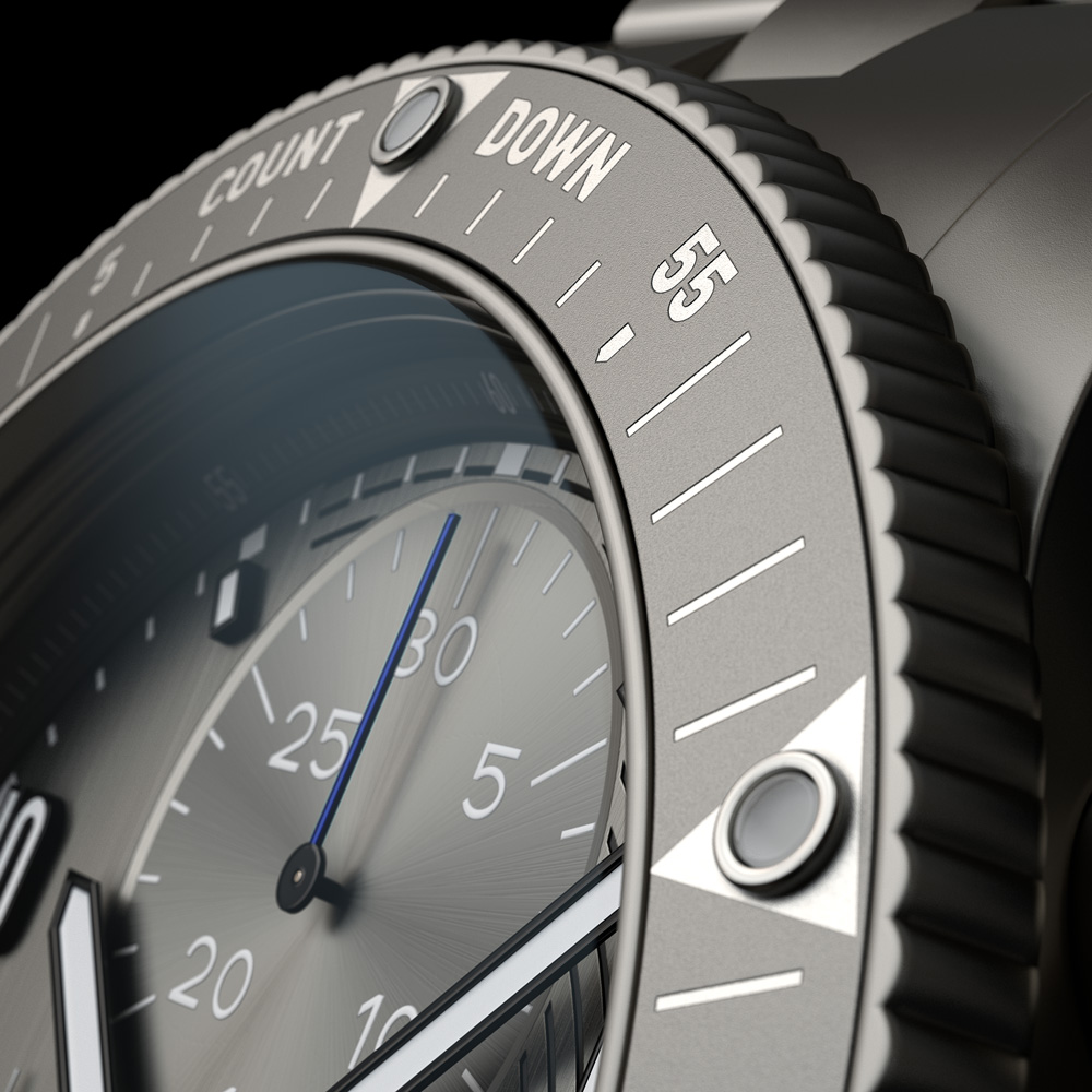 スイス製自動巻ムーブメントCal.UW-50(48時間パワーリザーブ)、28,800振動、時・分・秒(スモールセコンド)表示、デイデイト表示、クロノグラフ(30分積算計)、ミッションコントロールベゼル(逆回転防止ベゼル)、時・分針とクロノグラフ秒針、アプライドインデックスは暗所でブルーに光るスーパールミノバX1仕上げ。