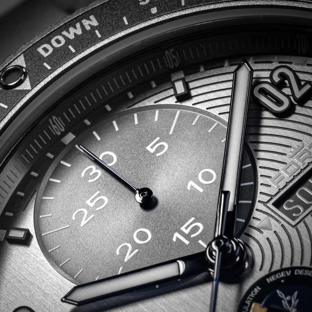 ダイヤルの6時位置にはアマディ20のミッションロゴが配され、11時から5時位置のあたりにはエンボス加工を施したラインが入っています。これは、約25度の地軸を持つ火星の軌道を表しています。また、数字のアプライドインデックスは「02」「04」といったデザインになっており、これはアナログ宇宙飛行士たちが時間を表す際に、たとえば6時8分を「0608」と言うように、ゼロを付けた表示にしています。ベースのヘアライン仕上げにグランドカウンターのサンドブラスト加工、エンボスのラインなど、表面には複数の加工を施してそれぞれの部分を強調しています。