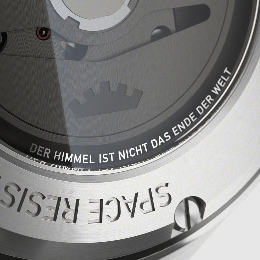 12時位置のケースの見返しリングや裏面には、次のようなメッセージが記されています。“Der Himmel is nicht das Ende der Welt.(空は果てしなく広がる世界)”